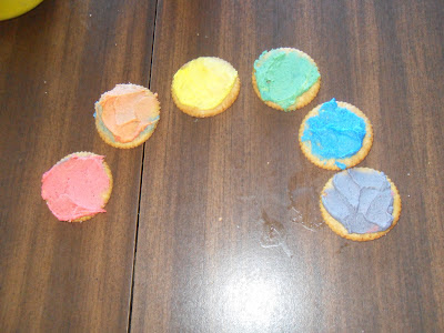 On day 4, we were supposed to make a paper rainbow, but Joshua wasn't cooperating, so I just got out the left over frosting and had them spread one cracker with each color, then I taught them the correct order of the colors in a rainbow.